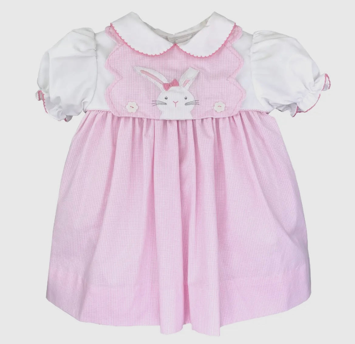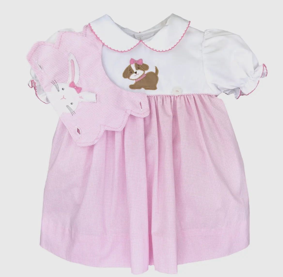 Nothing beats two outfits in one! This soft pink check cotton-poly blend dress features a removable Easter Bunny applique bib with a dog applique underneath, giving you a whole new outfit. Short puffed sleeves. Matching bloomers are included for sizes 3 months through 24 months only. Reg. $44