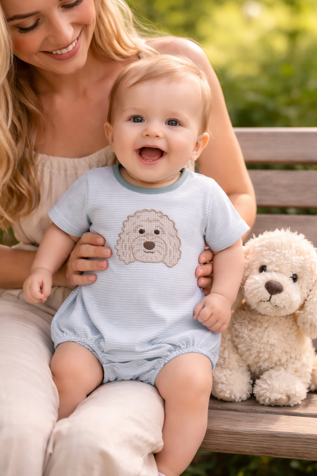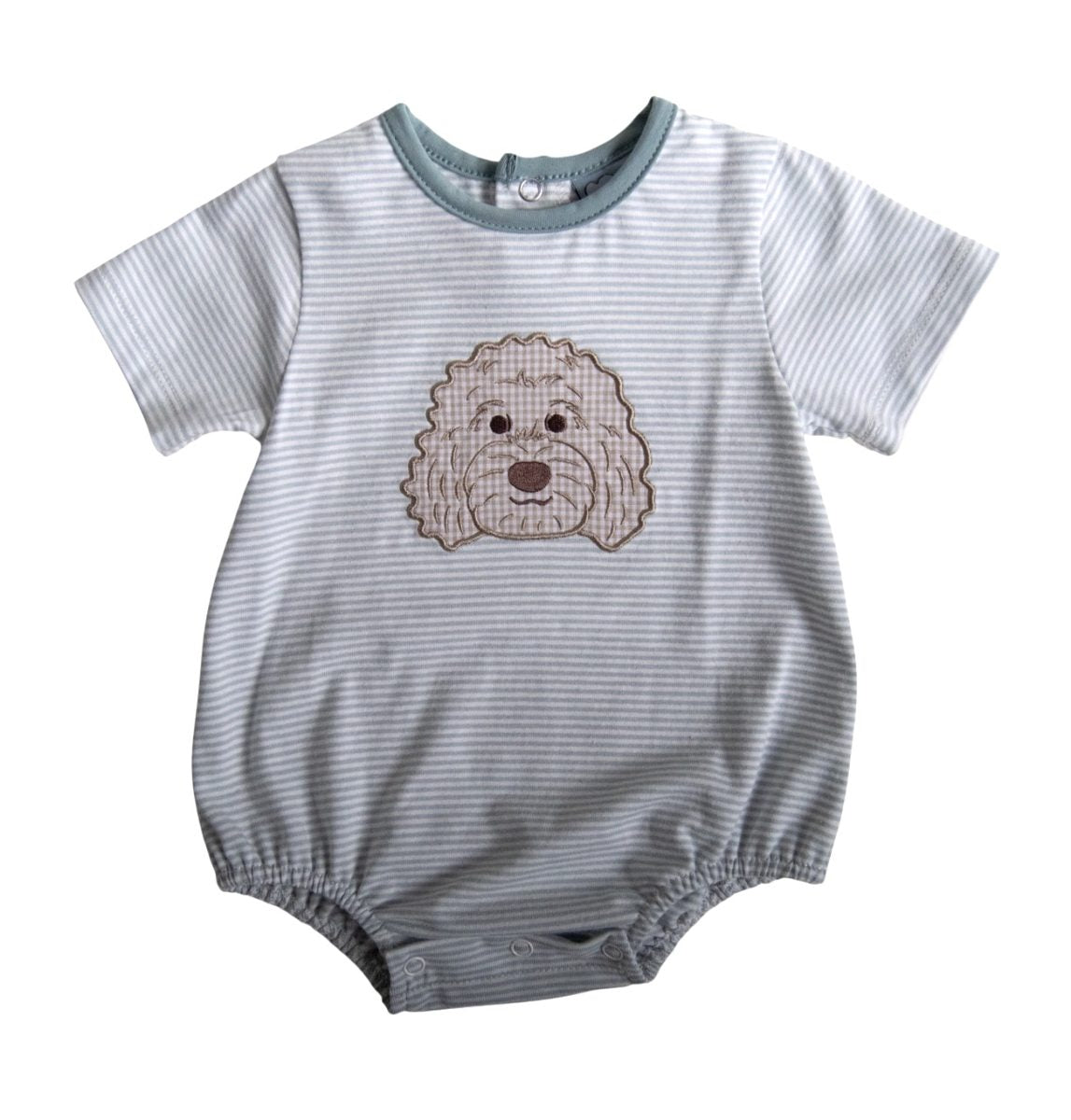 Sweet, soft, and perfect for your little pup lover, the Three Sisters Baby Doodle Boy’s Bubble is an everyday classic with irresistible charm. Made from lightweight knit fabric in soft blue and white micro-stripes, this bubble features a beautifully stitched doodle dog face appliqué front and center for a playful yet polished look. Designed with comfort in mind, it includes short sleeves, a coordinating contrast neckline, and a relaxed bubble silhouette with gentle elastic at the legs for that traditional baby fit. Convenient snap closures at the bottom make changes quick and easy, while the breathable fabric keeps him cool and comfy all day long.