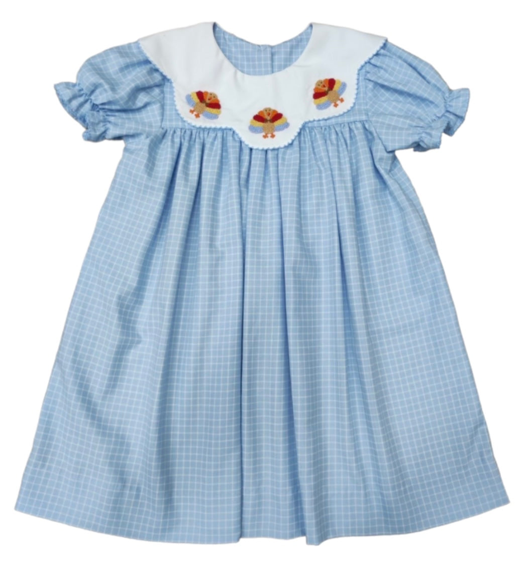 Dress your little one in charming style with this light blue check bishop dress, featuring a scalloped color adored with french knot turkeys. Made of 65% polyester, 35% cotton. Sizing is very generous.