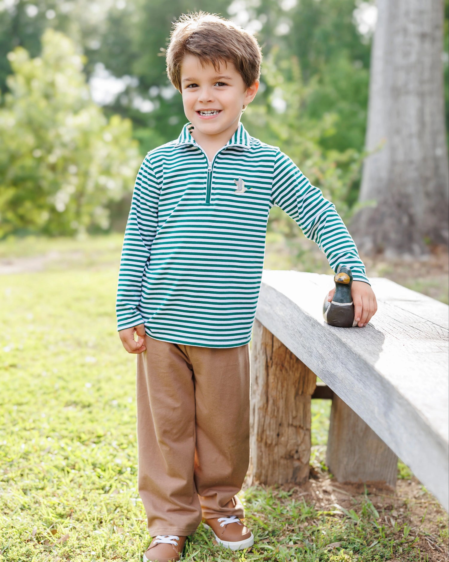 Cozy up for fall adventures in our Hunting Buddies Pullover! This playful stripe quarter zip features an adorable small duck embroidery that adds just the right touch of whimsy. Perfect for chilly mornings or evening bonfires, this pullover keeps you stylish while embracing the autumn spirit. Matching little brother option available. Material: Knit. 95% Cotton 5% Spandex.
