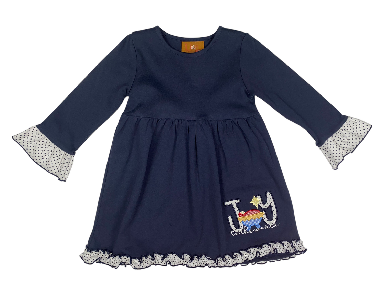 Wrap her in the joy of the season with our Joy to the World Dress, a sweet and meaningful holiday piece she'll treasure. This charming navy blue dress features a beautifully stitched “JOY” applique with a tender manger scene in place of the “O,” capturing the heart of the Christmas story. Below it, “to the world” is delicately embroidered as a loving reminder of the reason we celebrate.