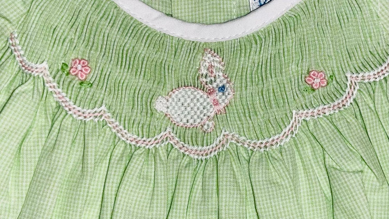 Tiny green and white check short-sleeved Easter dress. Features a smocked bunny, flowers, and scalloped border around the smocking plate. 55% cotton. 45% polyester. Comes with matching bloomers. Reg. $40