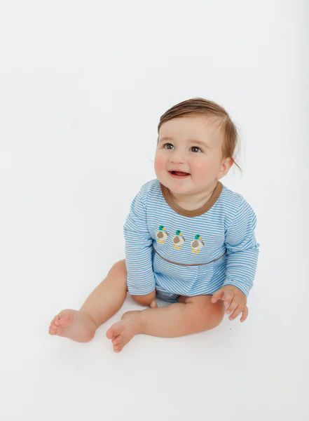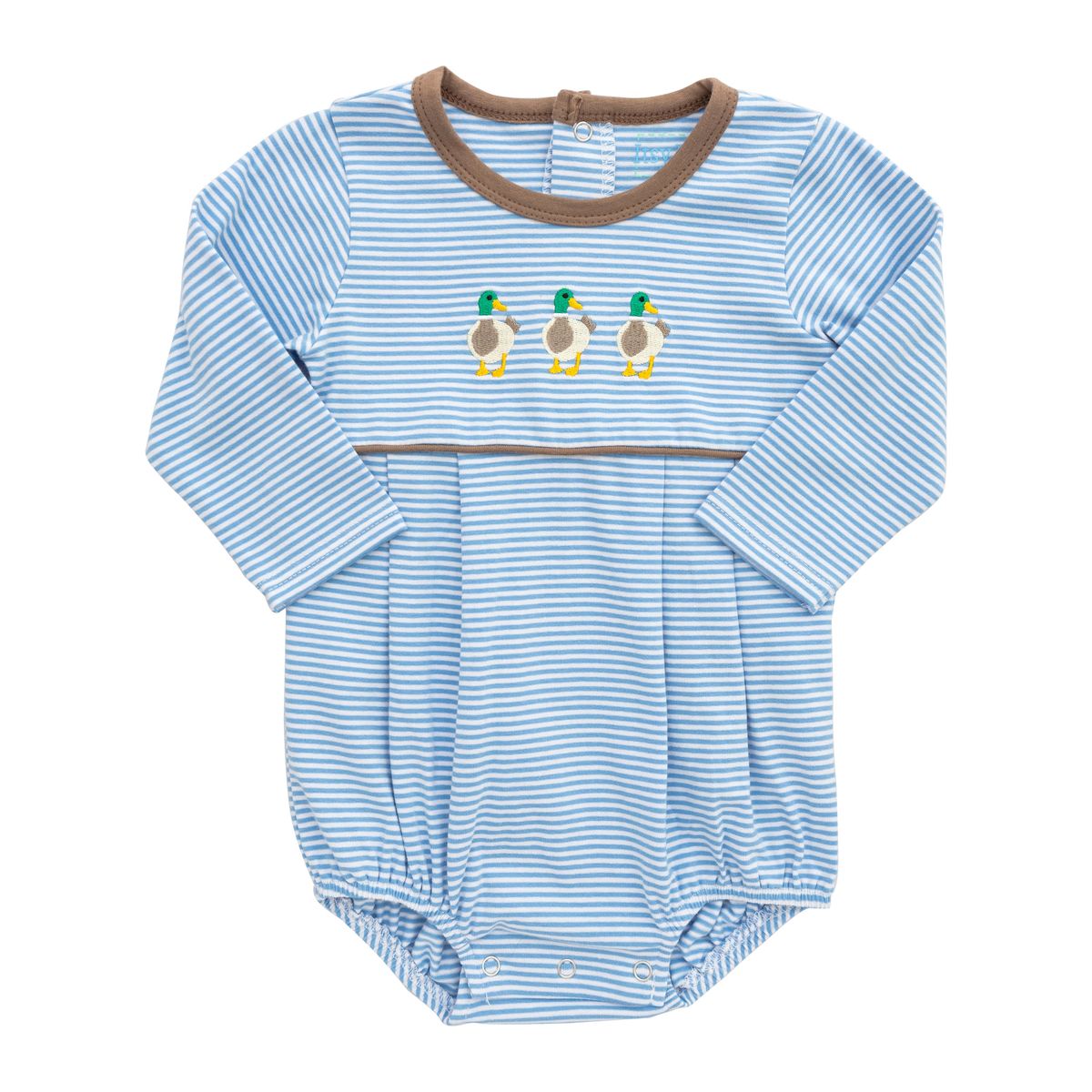 Blue and white striped long-sleeve boy bubble. Features three mallard ducks embroidered on the front. Trimmed in brown with brown piping just above the pleats. Snaps in the back and at the crotch for easy diaper changes. 95% cotton. 5% spandex.