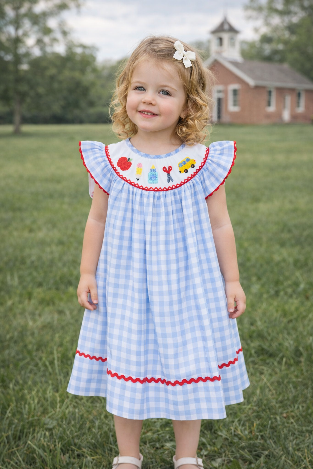 Adorable light blue and white check bishop dress with hand-smocked school theme along the collar. Angel-sleeves with red ric rac trim. 100% cotton.
