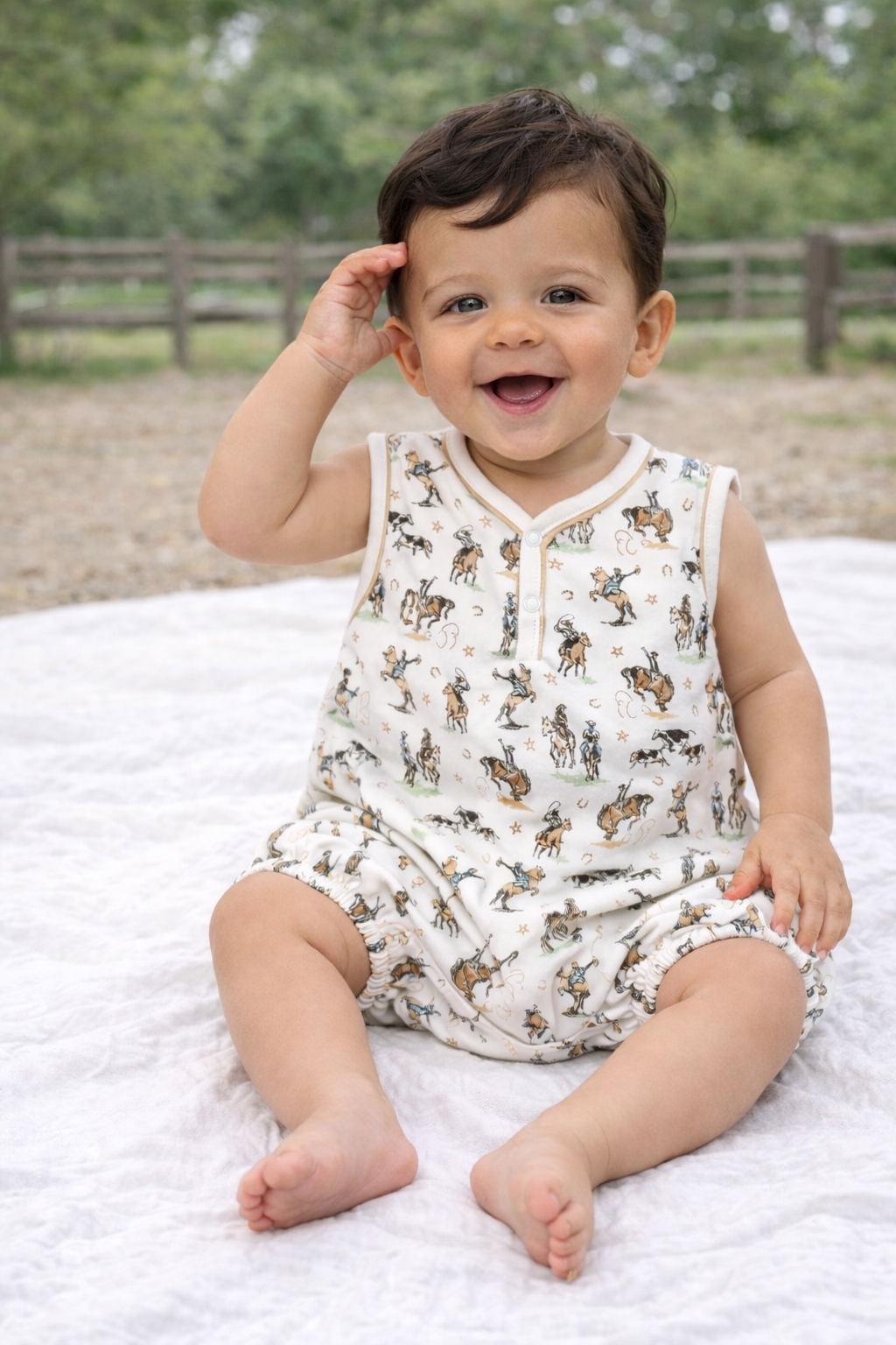 Bring timeless western charm to your little one’s wardrobe with the Magnolia Baby Wild West Bubble in Driftwood. This classic bubble features an all-over vintage-inspired cowboy print with bronc riders, horses, cattle, and subtle western icons set against a warm driftwood-toned background for a soft, neutral look.